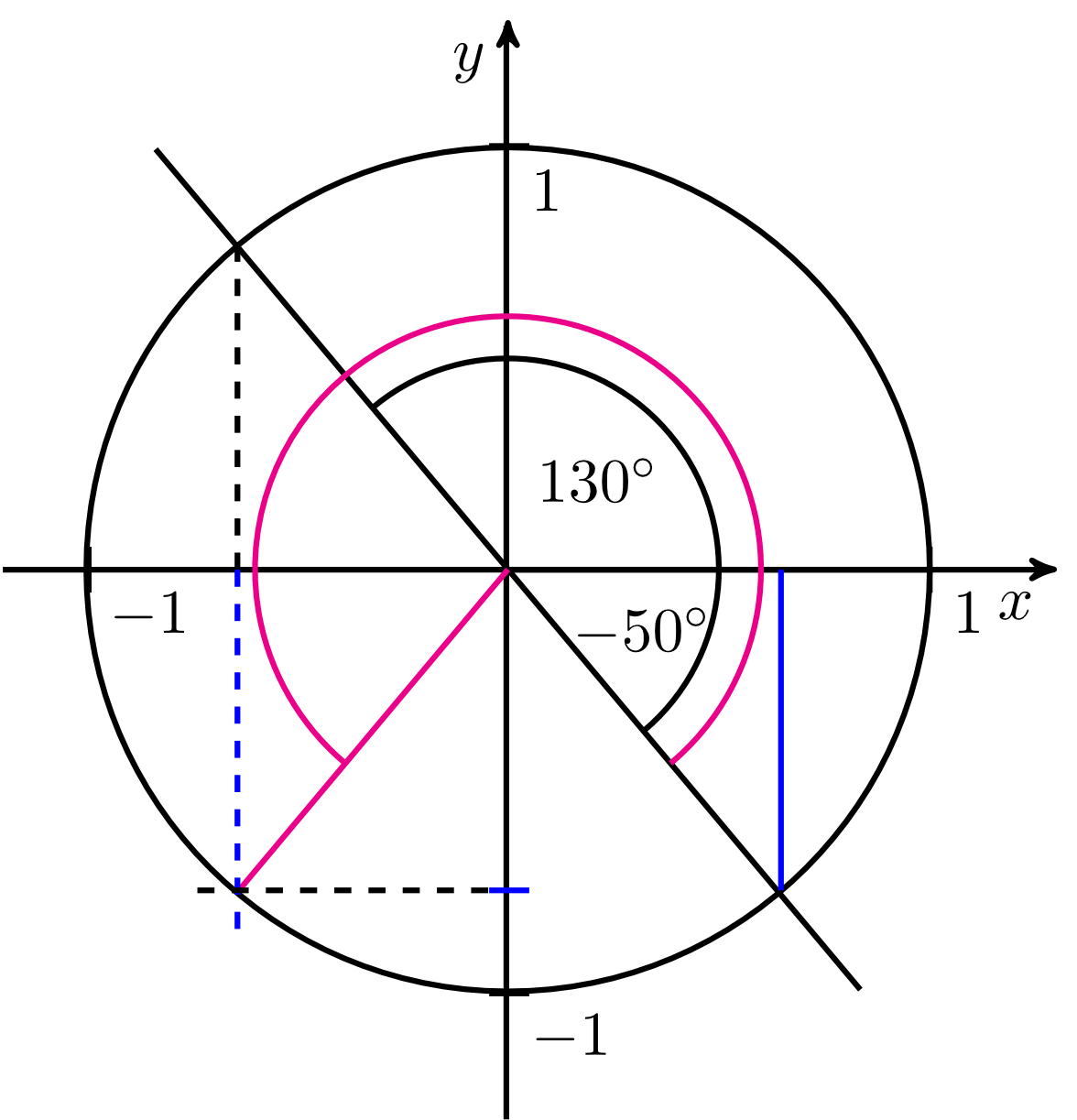 Anhand der Zeichnung erkennt man, dass der negative Kosinuswert zum Winkel und zu gehört. Ebenso kann der negative Sinuswert zu und zu gehören. Da dieser Wert im oben genannten Bereich liegt, ist der gesuchte Wert des Winkels, der in der Zeichnung rosa gekennzeichnet ist.